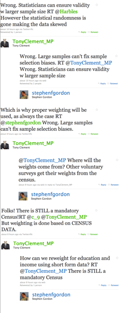 This was the first, and my favourite tall tale. People forget but at the very beginning of this debate the minister claimed the change would have no impact on the effectiveness of the census. In an online discussion with concerned Canadians who pointed out that the data from a voluntary long form census would be rendered useless because of selection bias, the Minister responded: “Wrong. Statisticians can ensure validity w larger sample size.” Of course, any first year undergrad student will tell you, this is not the case. Fortunately, Stephen Gordon a professor at the Laval University was on hand to set the record straight. (see debate to the right).