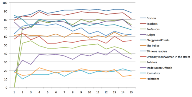 Contrary to what news people would have you believe, my sense is that most people don’t trust newspapers – no more so then they trust governments. Starting in 1983 Ipsos MORI and the British Medical Association have asked UK citizens who they trust. The results for politicians are grim. The interesting thing is, they are no better for journalists (although TV news anchors do okay). Don’t believe me? Take a look at the data tables from Ipsos MORI. Or look at the chart Benne Dezzle over at Viceland created out of the data.
