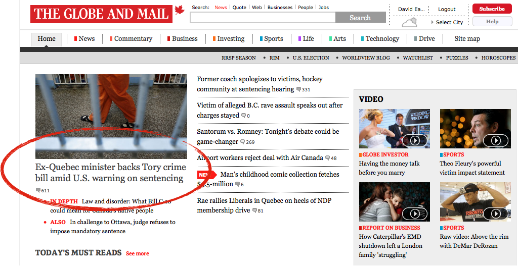 Earlier today the Globe and Mail had one of these truly terrible “balanced” articles about the proposed federal crime bill. The headline screamed: Quebec expert backs Tory crime bill amid U.S. warning on sentencing. (Image below)
