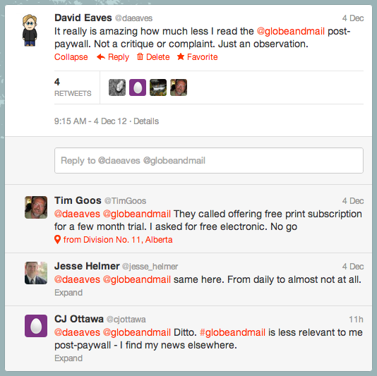 Well, in Canada several newspapers have thrown up paywalls – including the Globe and Mail (the main national newspaper) as well as the main “traditional” newspaper in my market – the Vancouver Sun. Each offers something like 20 free articles a month – akin to what the New York Times does. I also assume (but confess I don’t actually know) that if you arrive at an article via facebook or twitter, it does not count towards that total.