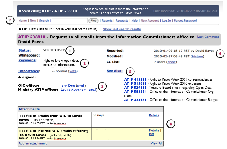 3. Individual accountability: Now you can see who is monitoring the request on behalf of the Office of the information commissioner and who is the ATIP officer within the Ministry. If the rules permitted then potential the public servants involved in the document might have their names attached here as well (or maybe this option will only be available to those who log on as ATIP officers.