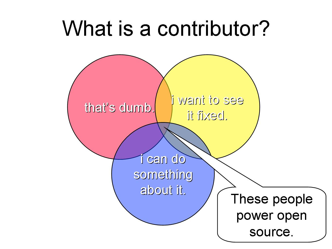 Part of this has to do with finding it easier to accommodate people into a broader set of roles. As Angie Byron (and others) point out, participation isn’t just about coding: It’s about donations, advocacy, documentation, marketing, user support, testing, translations, graphic design, event coordination, bug reports and feature requests, issue queue “farming”, usability, project management, and (among other things) coding. But it is also about nurturing those who have the skills but may sit on the periphery or outside the sweet spot altogether – getting them comfortable with the project, the community and the processes. Often open source projects have a rough and tumble approach to newbies, I’m not sure that this is the best path to growth.