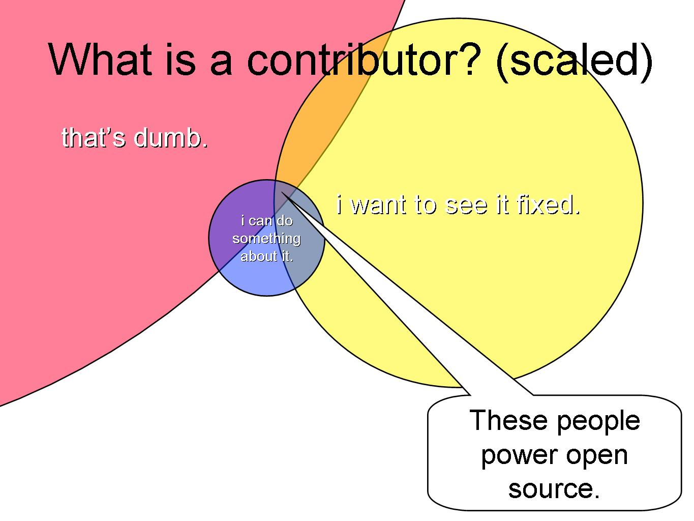 That begins with having a better model of what current contributors look like. To that end I’ve remixed Angie’s slide and tried to make it more to what I think “scale” would look like.