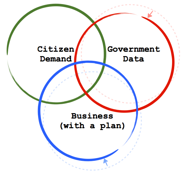 Which leads me to point two. Yes, at the moment, I think that target in the middle of this model is relatively small. But I think we can make it bigger. The GTFS shows cities, citizens and companies that there is value in open data. What we need are more examples so that a) more business models emerge and b) more government data is shared in a structured way across multiple jurisdictions. The bottom and and right hand circles in this diagram can, and if we are successful will, move. In short, I think we can create this dynamic: