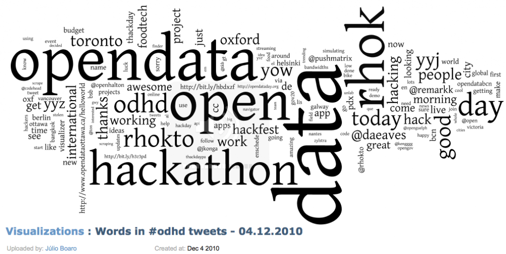 How many you ask? We can’t know for certain, but organizers around the world posted events to the wiki in over 50 cities around the world. Given the number of tweets with the #odhd hashtag, and the locations they were coming from, I don’t think we were far off that mark. If you assume 20 people at each event (some had many more – for instance there were over 100 in Ottawa, Vancouver had close to 50, 120+ in New York) it’s safe to say more than 1000 people were hacking on open data projects around the world.