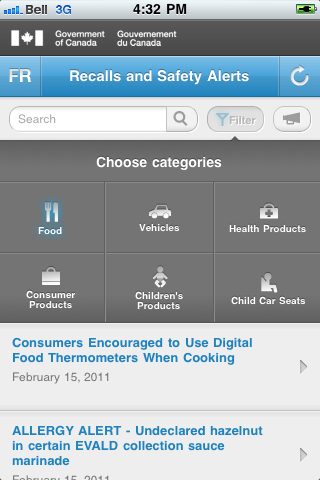 As a result, I suspect that those likely to pay attention to these innovations were probably those who were already paying attention. This is okay and even laudable. There is a small segment of people for whom these applications reduce the transactions costs of access. However, with regard to expanding the numbers of Canadians impacted my this information or changing behaviour in a broader sense, these tools have limited impact. To be blunt, no one is checking a mobile application before they buy a product, nor are they reading these types of widgets in a blog, nor is anyone subscribing to an RSS feed of recalls and safety warnings. Those who are, are either being paid to do so (it is a requirement of their job) or are fairly obsessive.