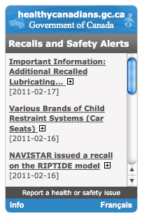 HC-Widgethc-appThe most cutting edge stuff I’ve seen is an effort by Health Canada to share advisories from Health Canada, Transport Canada and the Canadian Food Inspection Agency via three vehicles: an RSS feed, a mobile app available for Blackberry, iPhone (pictured far right) and Android, and finally as a widget (pictured near right) that anyone can install into their blog.