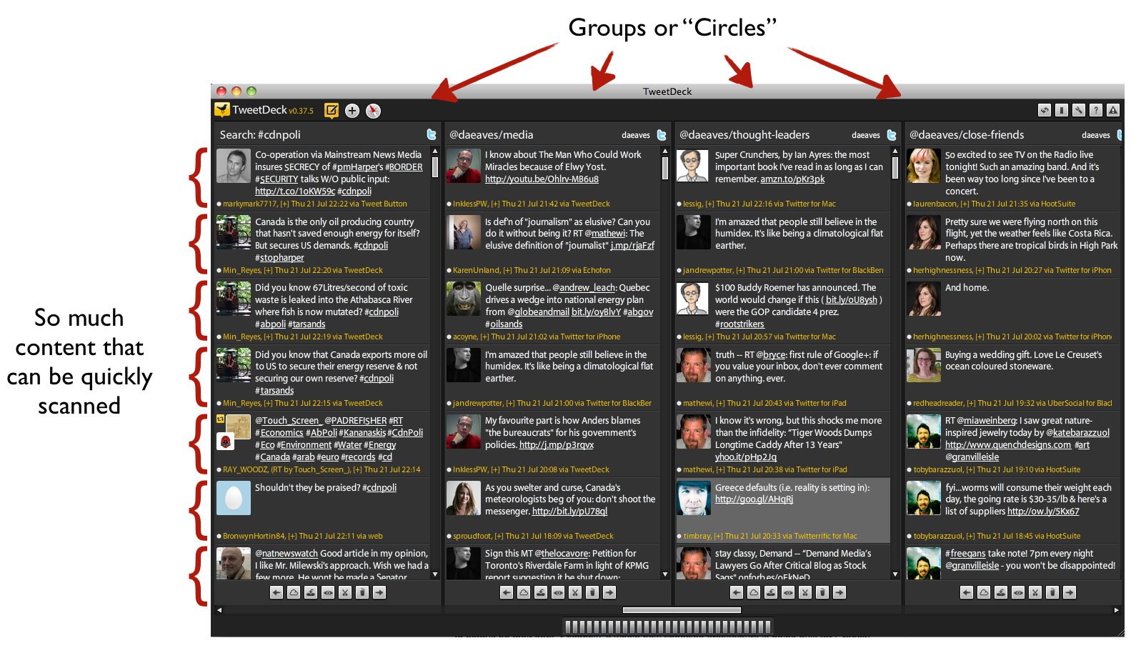 Consider the screen shot of TweetDeck below. Look how much information is being displayed in a coherent manner (of my choosing). It takes me maybe, maybe 30-60 seconds to scan all this. In one swoop I see what friends are up to, some of my favourite thought leaders, some columnists I respect… it is super fast and efficient. Even on my phone, switching between these columns is a breeze.