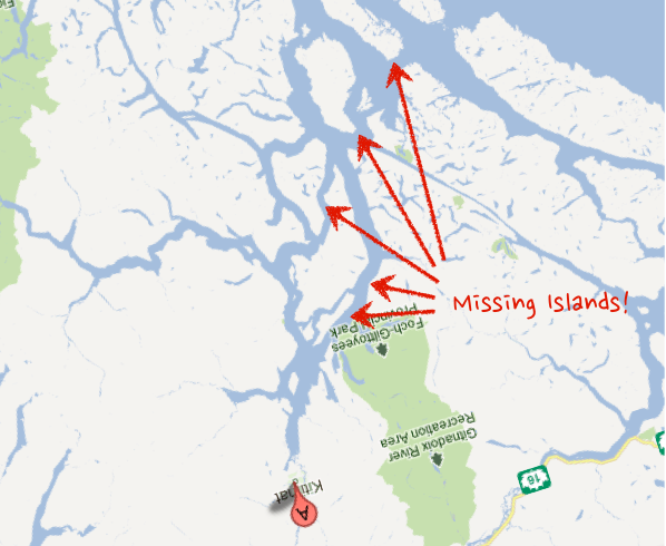 Of course there is a small problem with this map. The route to Kitimat by sea looks nothing like this.